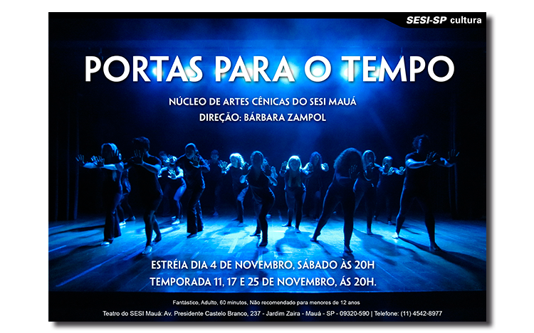 O espetáculo Portas Para o Tempo, parte integrante dos 30 anos de jornada do Núcleo de Artes Cênicas do SESI-SP, reflete sobre a morte e as relações humanas que compõe o tempo e a história. Questionando situações da vida, a peça acontece no SESI Mauá, nos dias 4, 11, 17 e 25 de novembro, às 20h. Os ingressos são gratuitos.